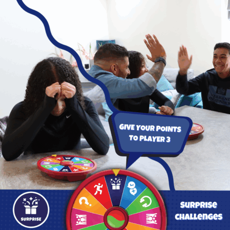 “Wheel U Dare?”: Do you dare to spin? Be careful…you’ll find challenges that score more points, some that lose points or even make you give points to your rivals! Did you land on the surprise space? The surprise could be good or bad.